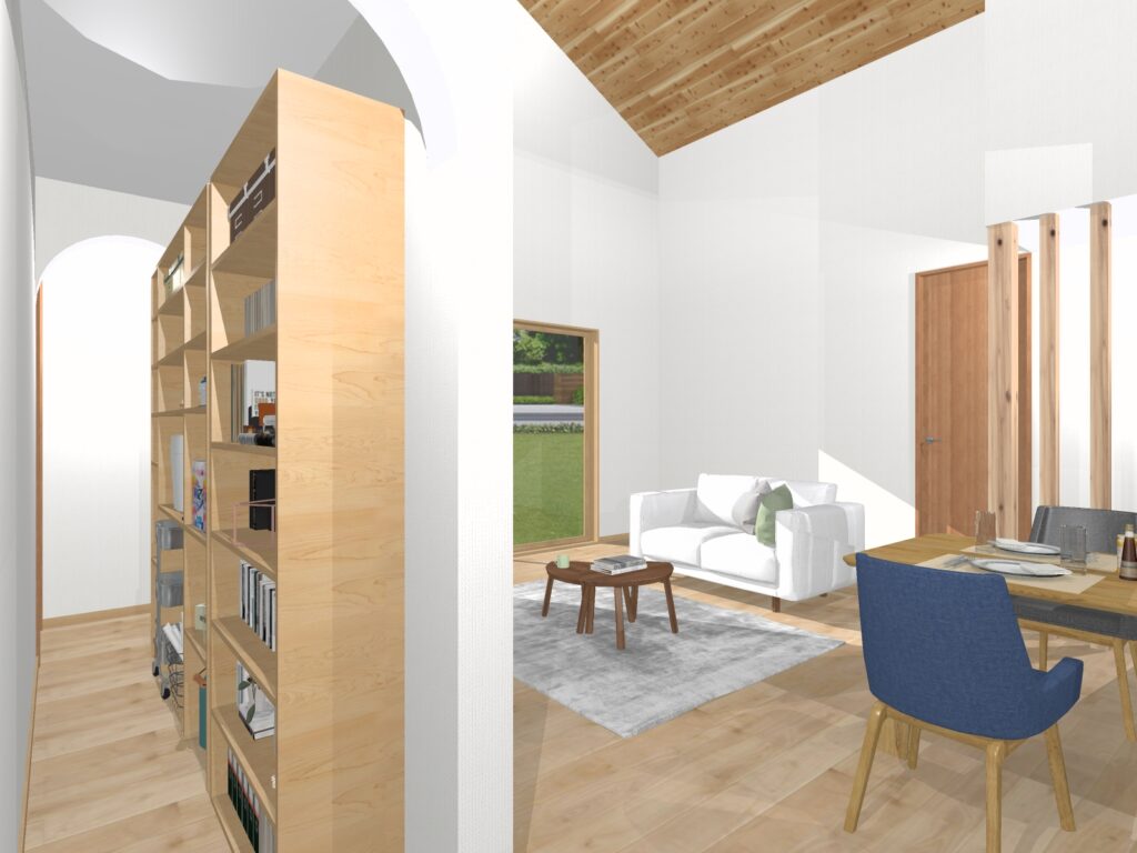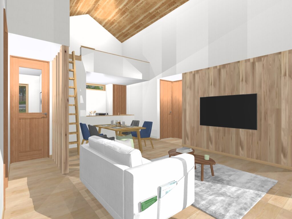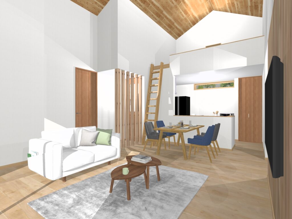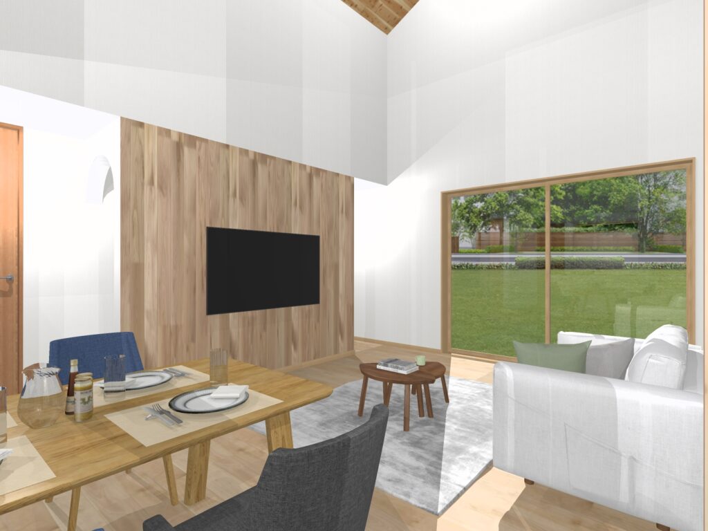 リビングダイニングの天井は勾配天井でより開放的に。