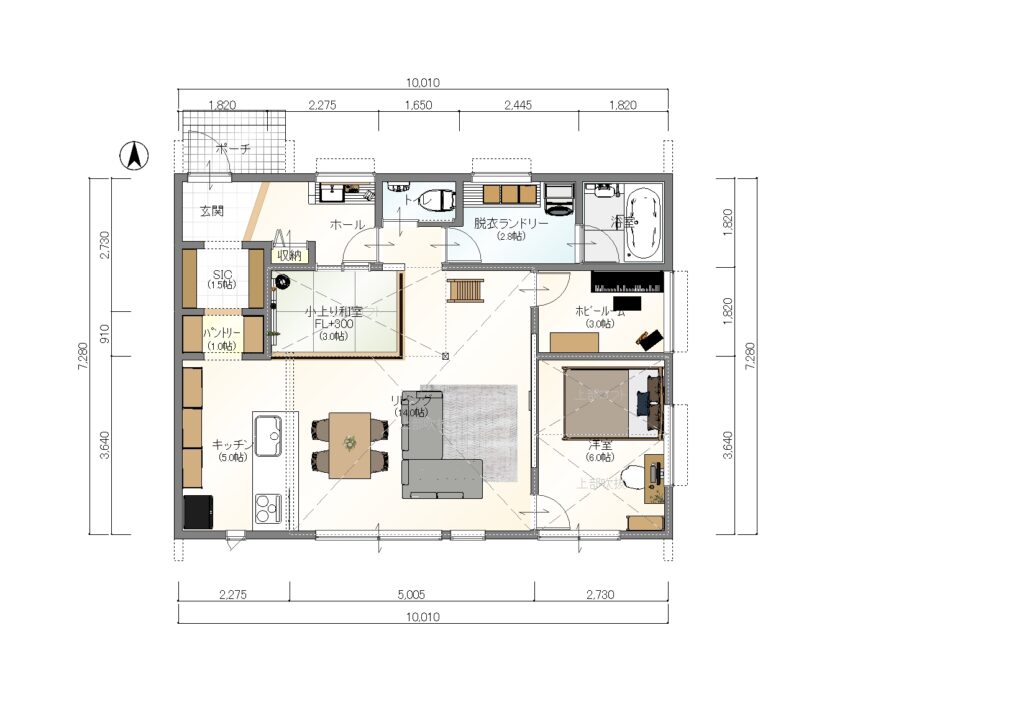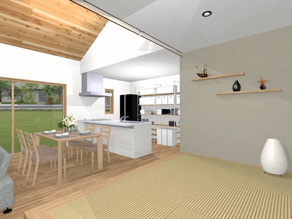 南に面した14帖の明るいリビングダイニングには3帖の小上り畳コーナーが隣接しており、